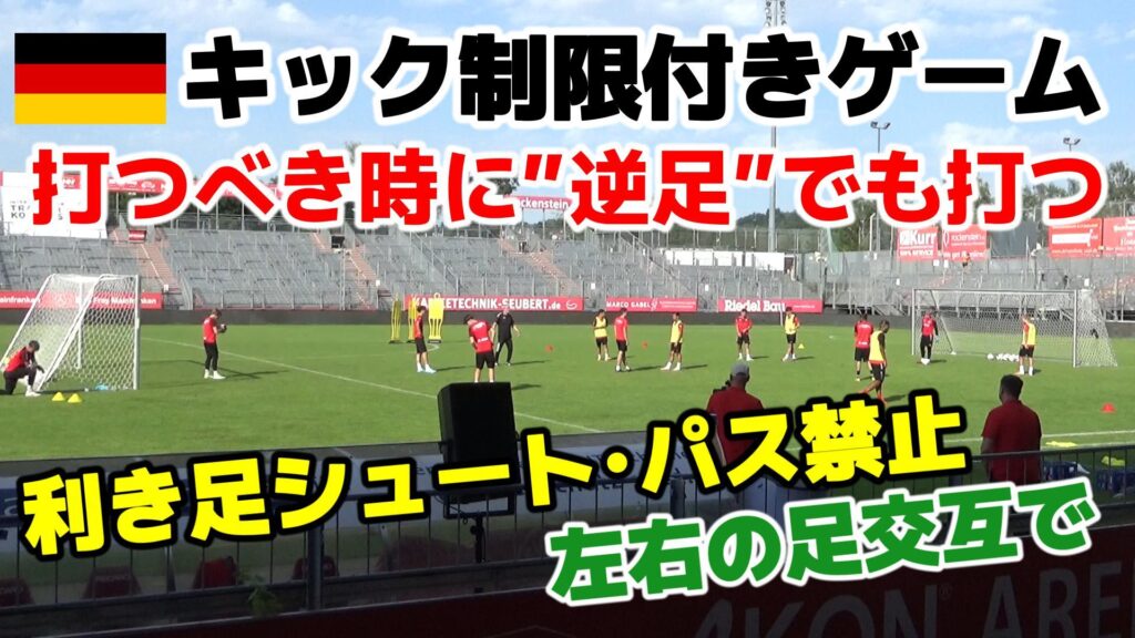 ドイツの国際指導者カンファレンス2024で紹介されたテーマ「ストライカーがどちらの足でもシュートを打てるようにする」ためのトレーニング➀➁③➃に続くメニューです。